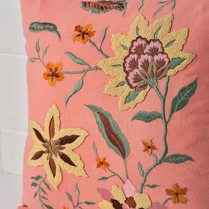 This luxurious cushion cover is meticulously hand-embroidered with intricate french knots and premium cotton threads on peach linen fabric. It celebrates the rich textile heritage with blooming florals, inspired by the charming Mughal gardens.