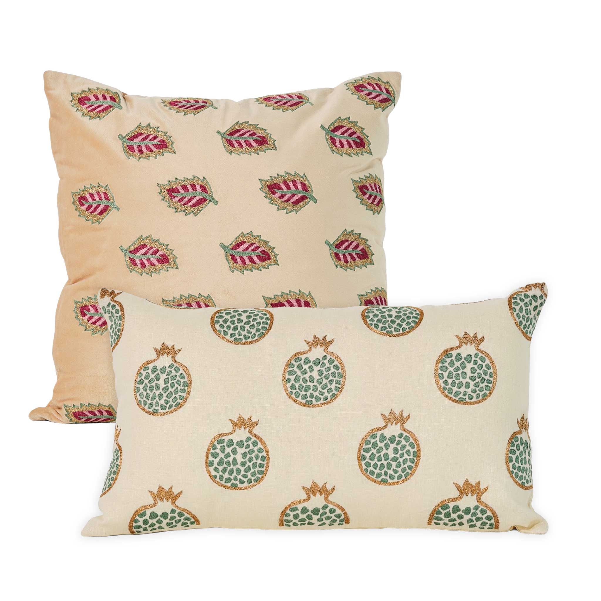 Immerse yourself in the natural beauty of our Gulzar Cushion Set, where delicate embroidery brings lush foliage to life. Together with the pomegranate cushion, with its vibrant hues and meaningful history, becomes a stunning focal point for your home.