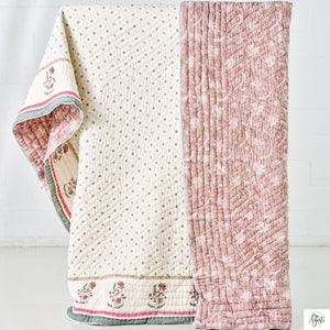 This is a reversible, handblock printed quilt. It’s printed on both sides so can be used either way.